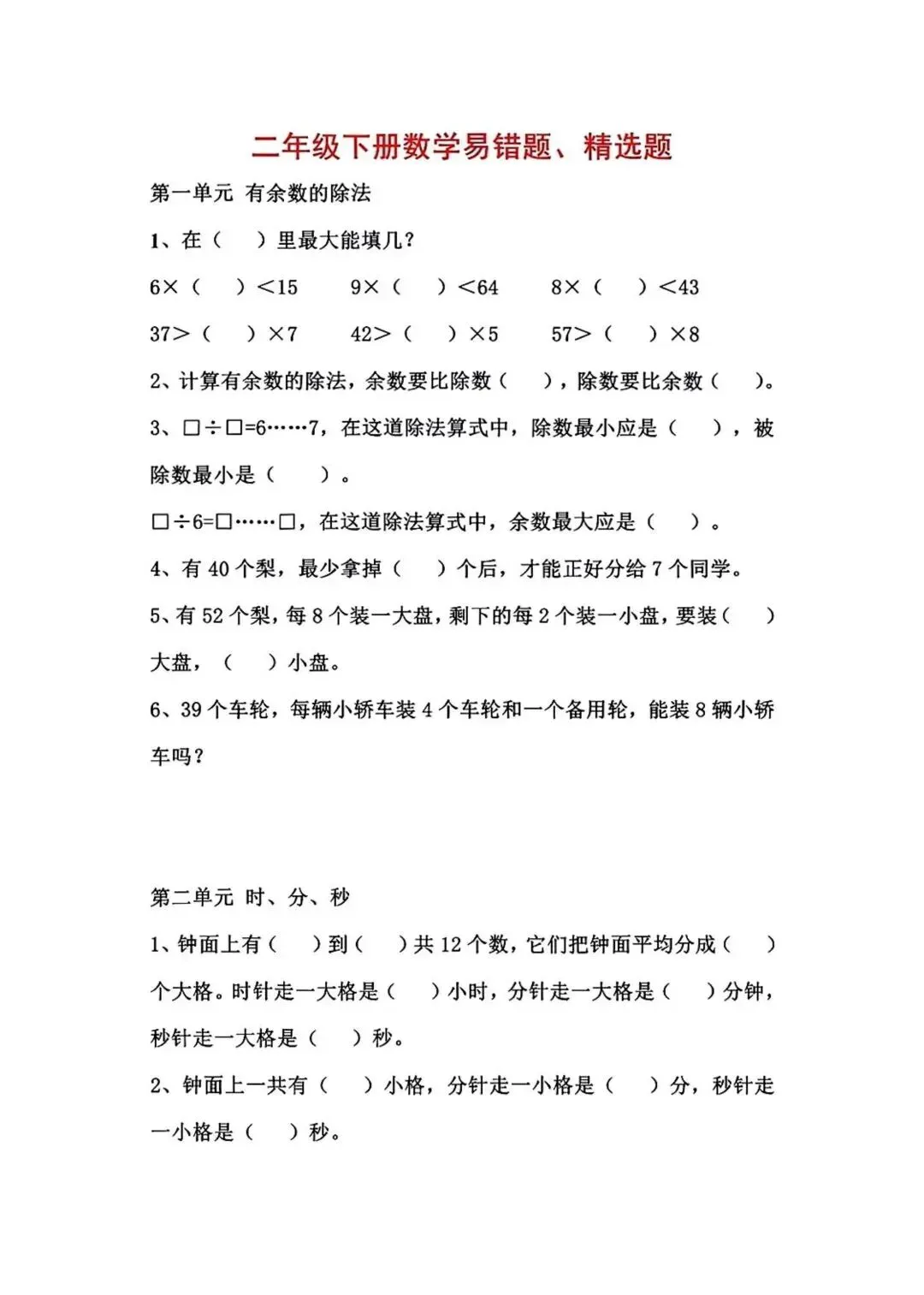 二年级数学下册1-8单元易错题汇总,家长可免费下载打印出来,帮助孩子学习,完整高清电子版,下载方式见文末。