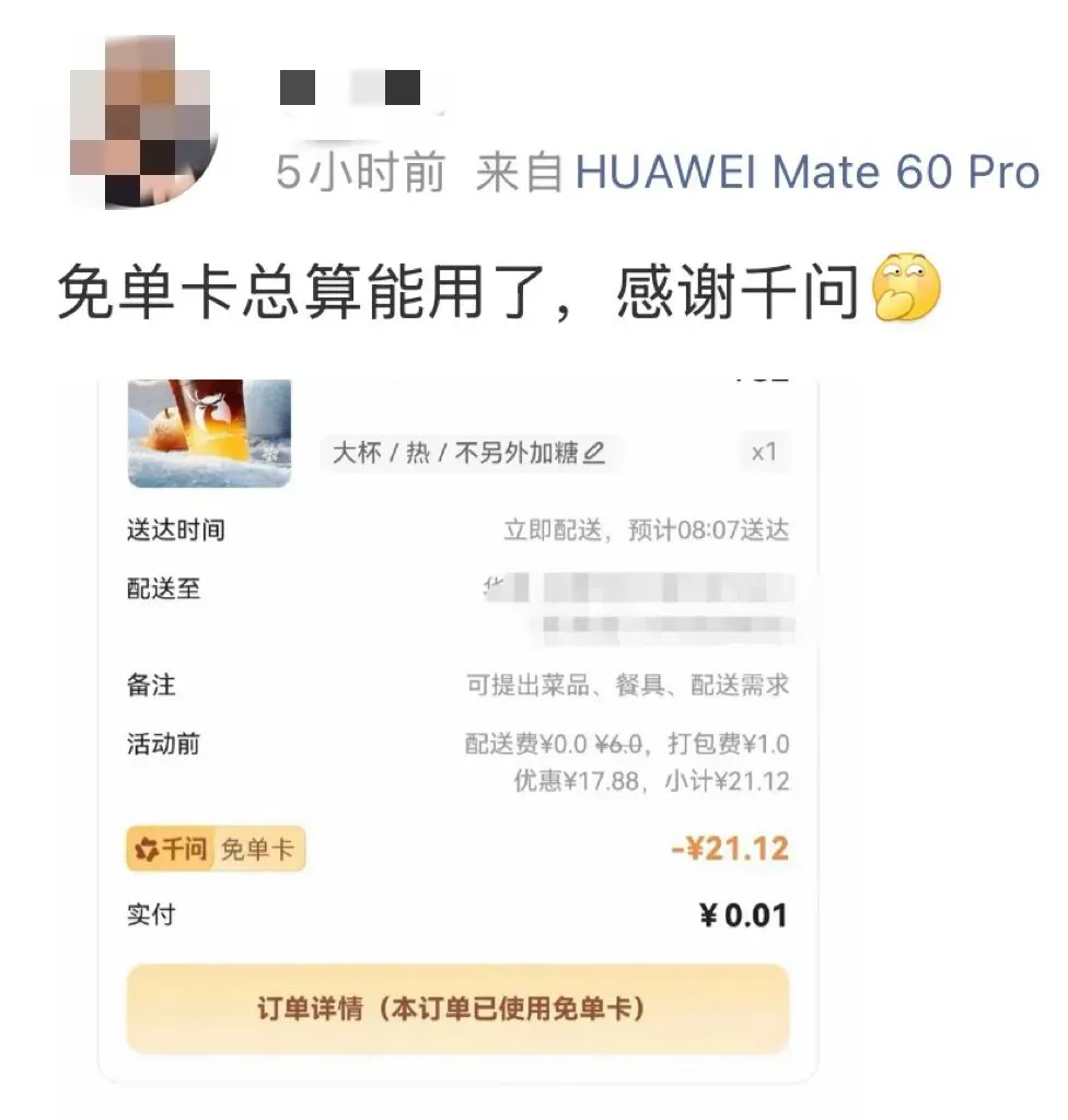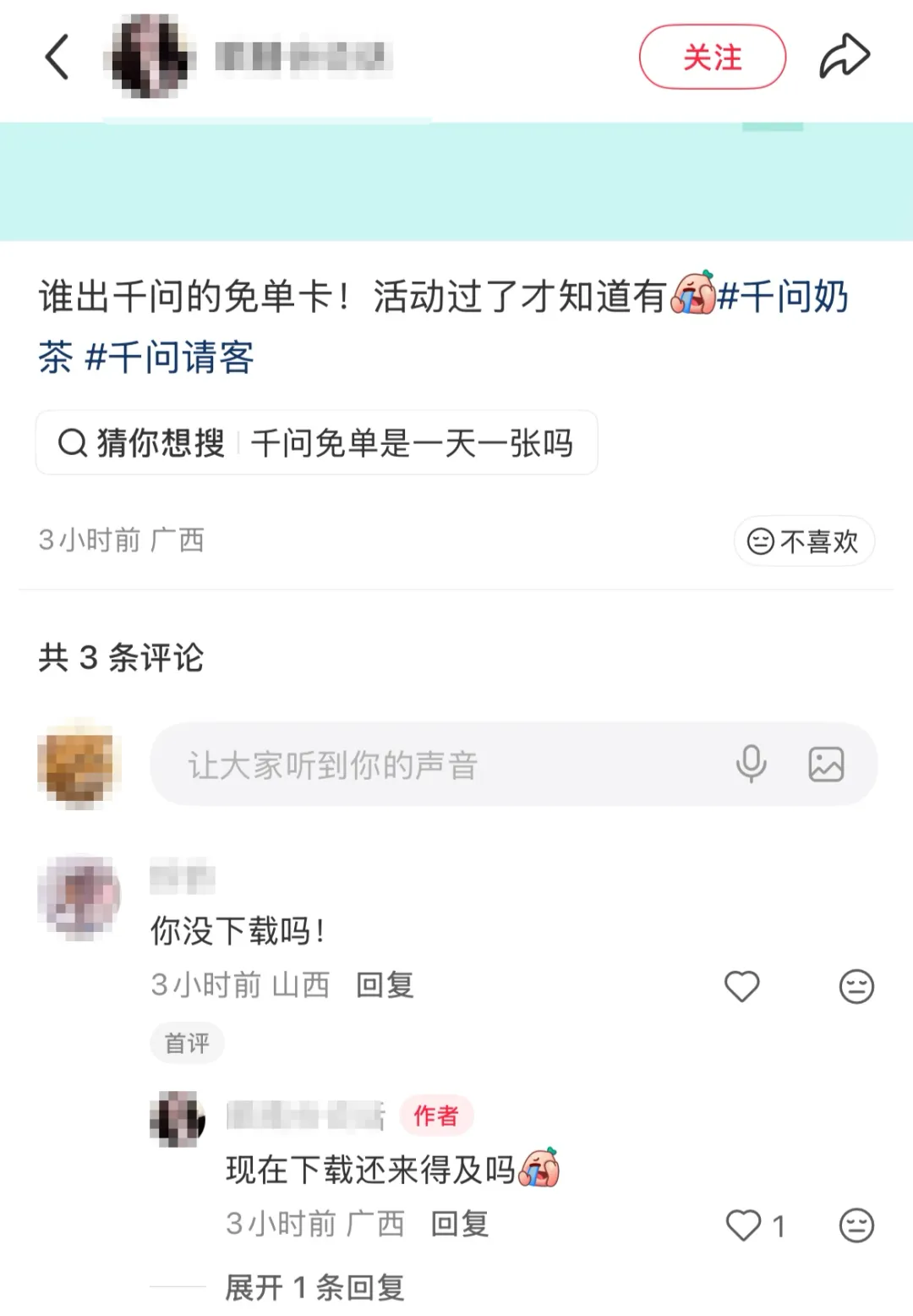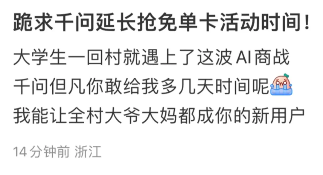 13日下午,千问回复到:已经在连夜研究方案,明天给大家答复。大家的反馈千问都收到啦!且容千问休息一下(发了一周的免单卡已手抽筋)~更多惊喜,14日见!