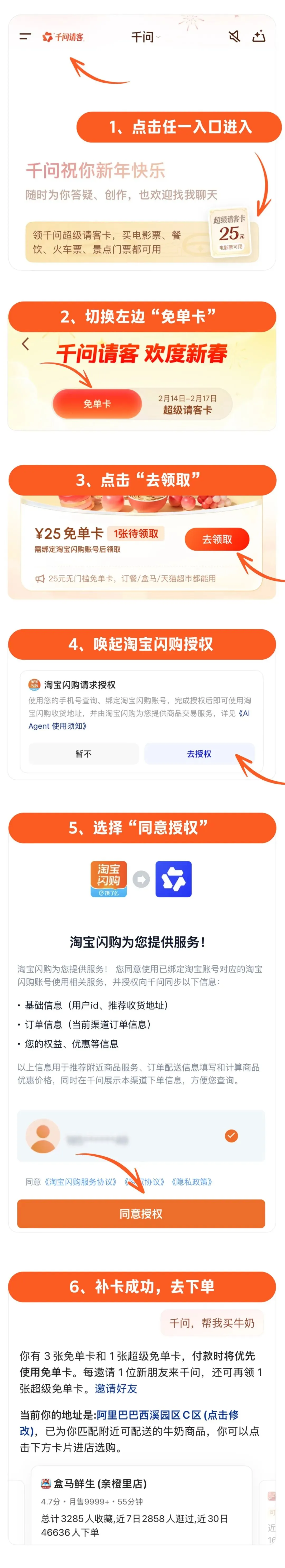 千问APP:针对因未成功完成淘宝闪购账号授权导致第一波免单卡未领取成功的,现已全部补发;“春节请客 瓜分30亿”活动第二轮仅剩最后三天