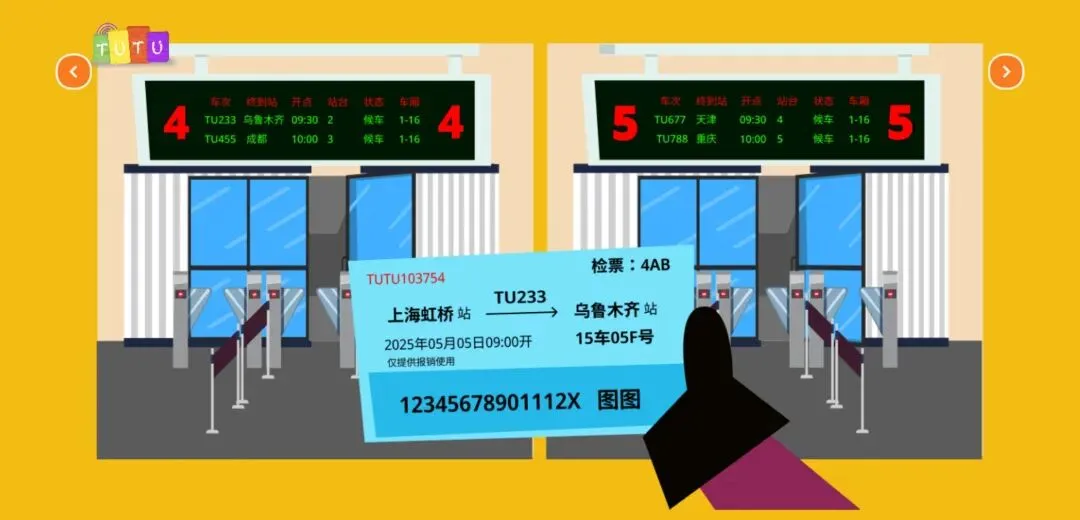 乘坐“超级高铁”探索城市风光,了解高铁的运行规则,参与实践搭建轨道,手持对应的座位编号来寻找正确的位置 ,享受和爸爸妈妈的第一次旅行时光。