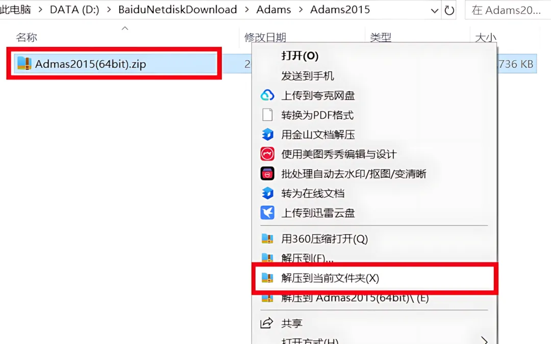 1.下载ADAMS2015软件安装包到电脑上,右键选择【解压到当前文件夹】。