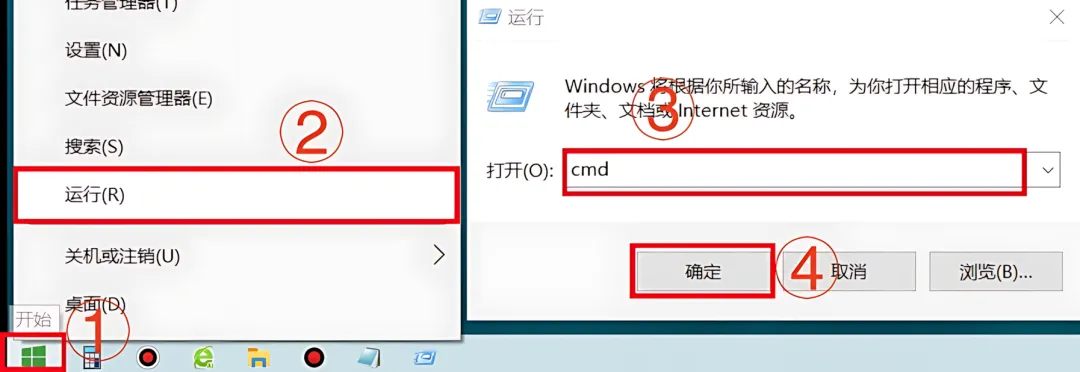 4.鼠标右击桌面右下角【开始】图标选择【运行】,输入【cmd】,点击【确定】。