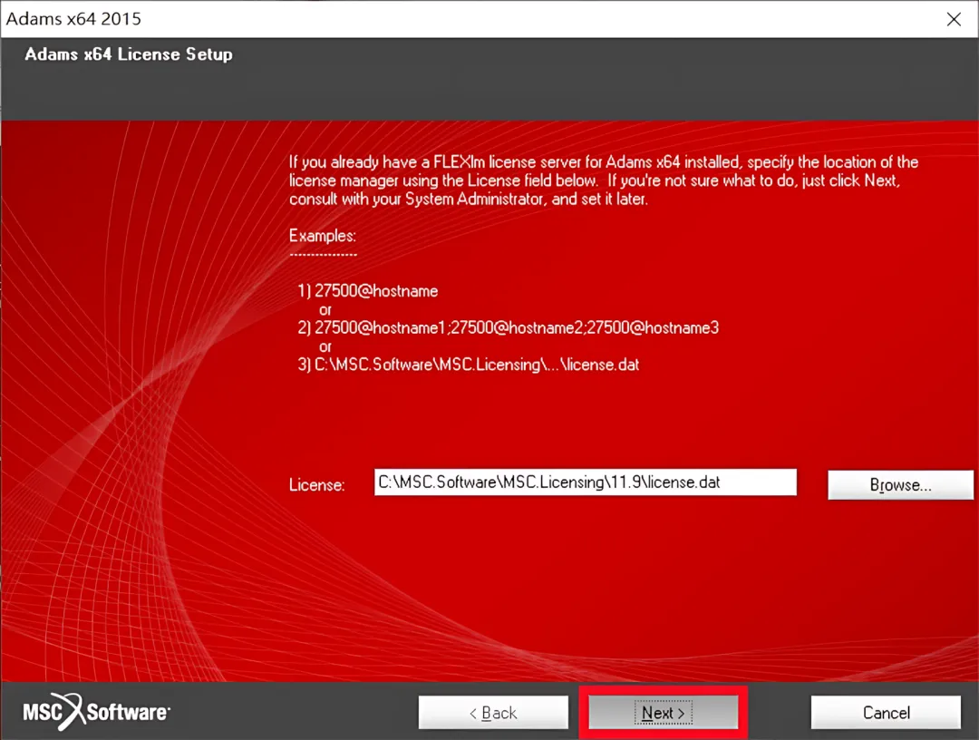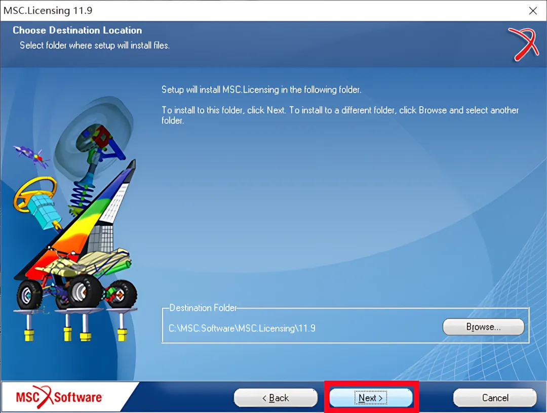 25.点击【Browse】可更改安装位置(建议不要安装在C盘,可以在D盘或其它磁盘下新建一个“Adams”文件夹。注:安装路径中不能有中文),点击【Next】。