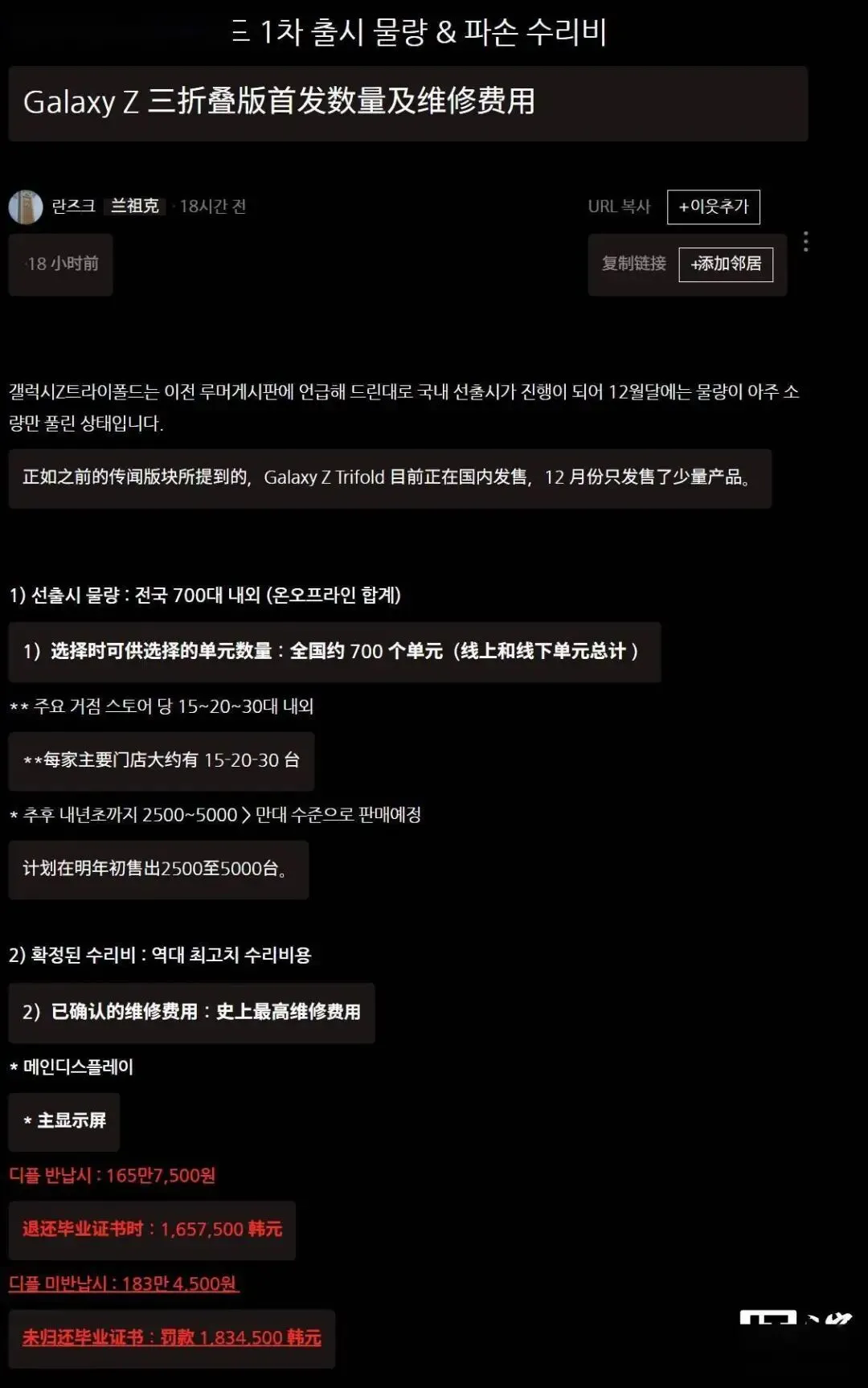 IT之家 12 月 13 日消息,消息人士 lanjeukeu 昨天在 NAVER 论坛发文,曝光三星 Galaxy Z TriFold三折叠手机的维修价格。