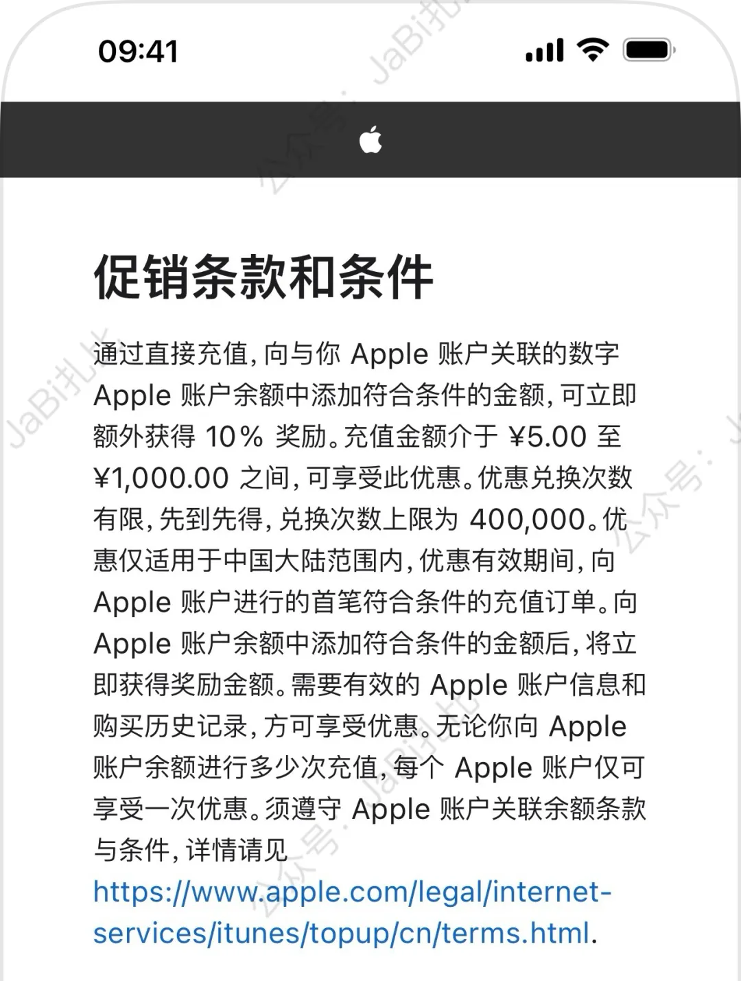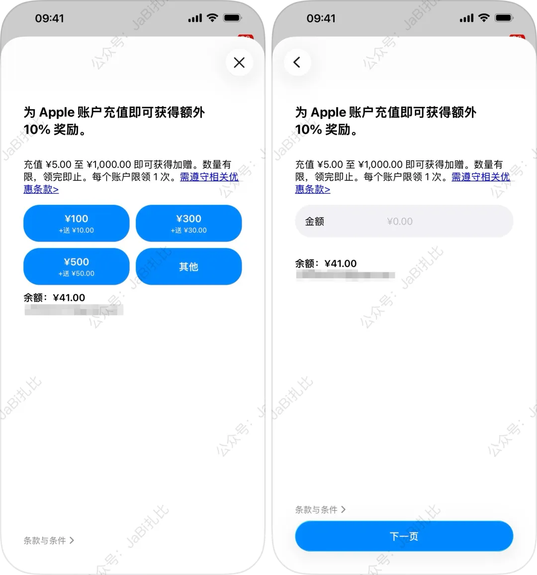近日,苹果在 App Store 再次上线了充值优惠活动。用户给 Apple 账户充值即可获得额外的10%奖励。比如你充值1000元,那么将可以额外获得100元,即到账金额为1100元。用户打开 App Store 后,点击右上角的头像,再点击「为 Apple 账户充值」可进入充值页面。这里就可以看到充值优惠活动啦。我们可以直接选择预设金额,也可以点击「其他」来手动输入金额。要求充值金额介于5元至1000元之间。和以往不同,本次活动没有限制时间,但限制次数。根据官方规则所示,本次优惠兑换次数上限是40万次。活动期间一人只能享受一次奖励。如果你平时有订阅 iCloud+、Apple Music、其他 App 会员或游戏充值的,就不要错过这次活动啦。先把金额充值到 Apple 账户上,可以用来慢慢抵扣使用。