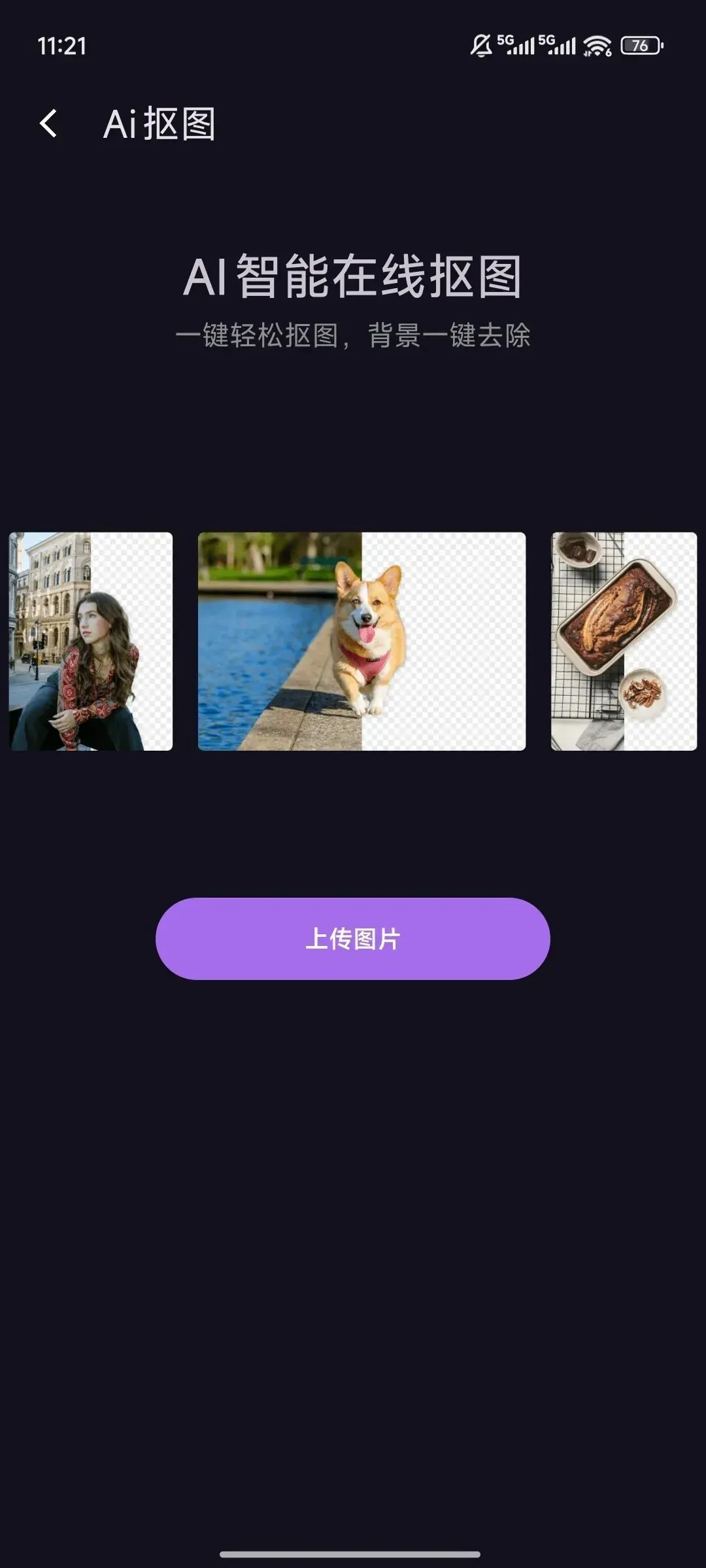 AI智能在线抠图,这也是一个很好用的功能,上传托片,直接一键智能抠图,看看我抠的这个动漫人物,细节处理的非常好,各种发丝都是细致抠出来(原图是没有脚的)。