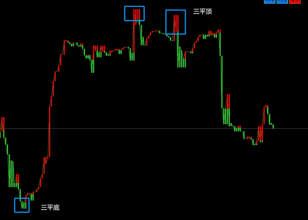 三平顶翻绿:在上涨过程中,连续出现三根高度相近的红色柱体(即股价创新高乏力),随后出现一根绿柱。这被视为一个较强的卖出信号。