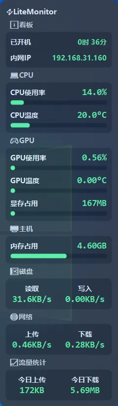 LiteMonitor 是一款轻量级、开源的桌面性能监控工具,专为 Windows 系统设计。可以实时监测 CPU、GPU、内存、磁盘和网络等关键性能指标,支持横/竖屏/任务栏显示、主题切换、多语言、透明度显示等,界面简洁且高度可配置 。除了基础功能还支持监控网络、查看硬件配置等,用户很轻松就能快速上手。