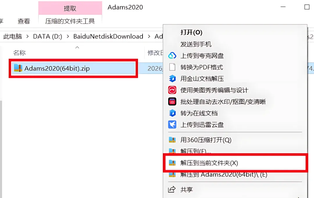 1.下载ADAMS2020软件安装包到电脑上,右键选择【解压到当前文件夹】。