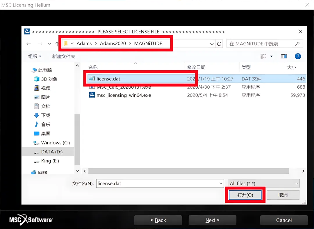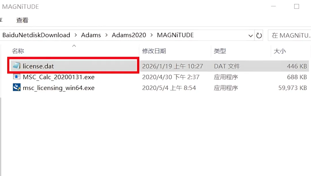 12.打开安装包解压后的【Adams2020】文件夹中的【MAGNiTUDE】文件夹并选中【license.dat】,点击【打开】。