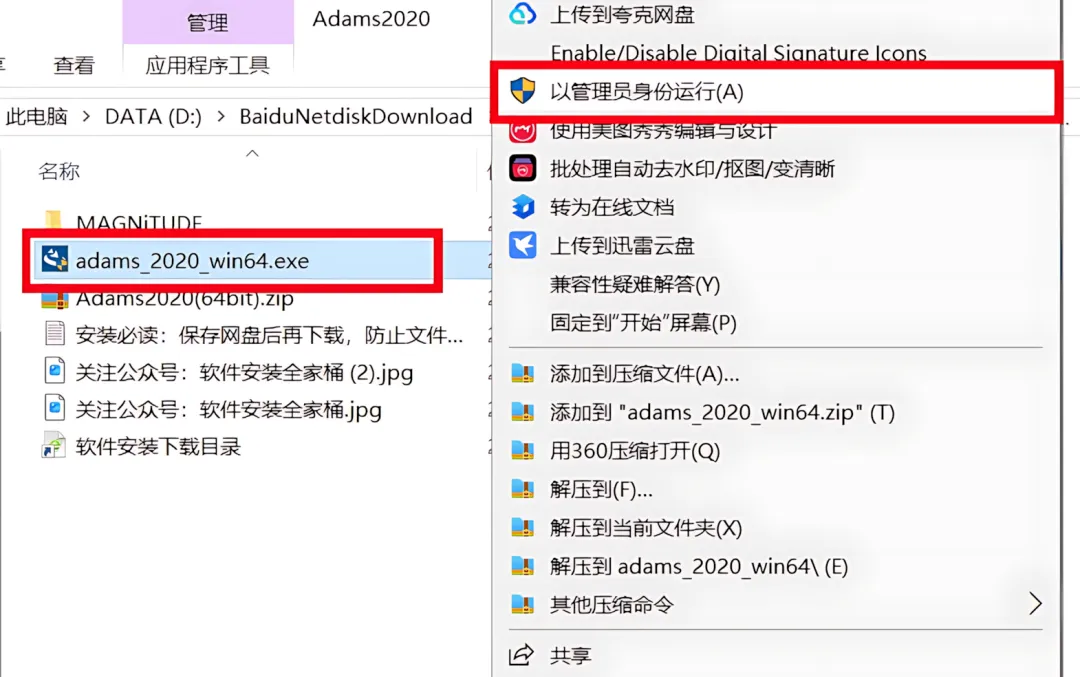 20.打开安装包解压后的【Adams2020(64bit)】文件夹,鼠标右击【adams_2020_win64】选择【以管理员身份运行】。