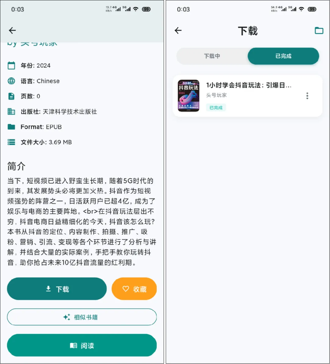 点进书籍详情页,年份、页数、出版社、文件大小一目了然。我试了下下载《1小时学会抖音玩法》,3.69MB 的 EPUB 文件,不到 10 秒就下完了,而且没有任何捆绑软件。