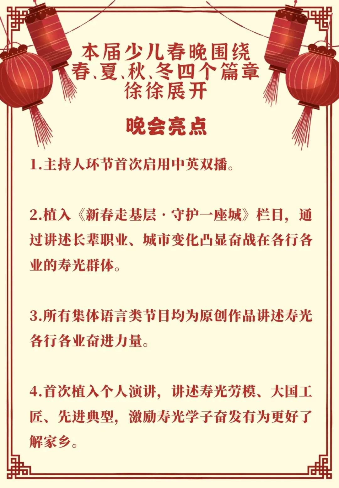 本次少儿春晚精心打造春、夏、秋、冬四大篇章,为大家呈现四季如画的精彩演出。
