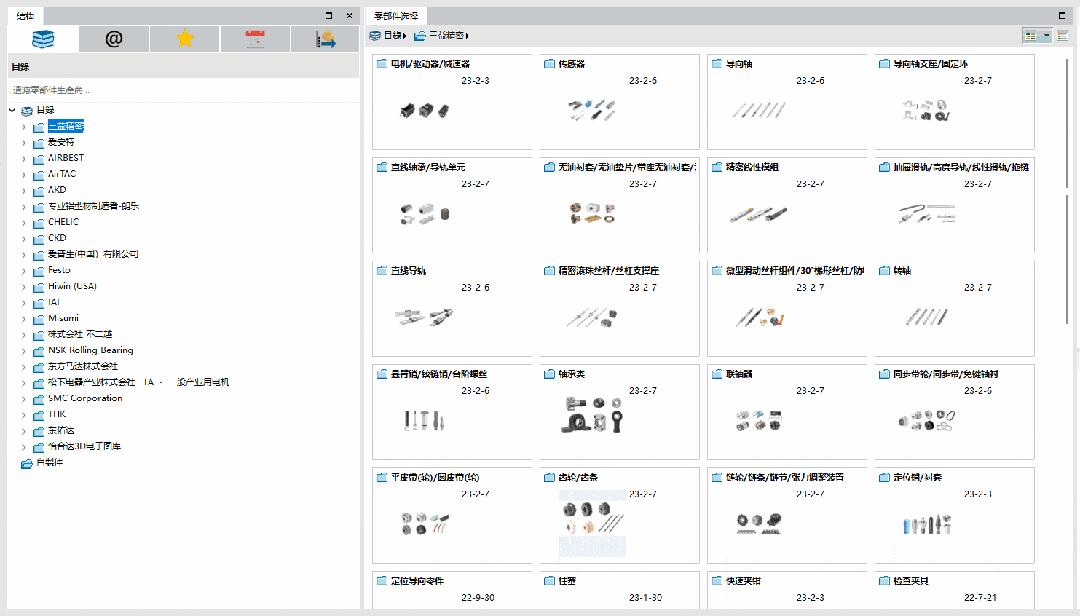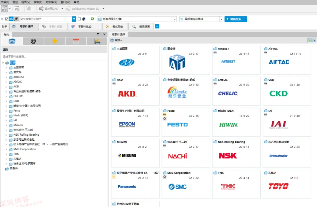 3、进入正题,点击【零部件选择】选择自己想要的品牌和模型,筛选规格,即可,米思米、亚德克、东方马达、怡和达、SMC、CKD、费斯托等21个自动化行业头部品牌的官方模型库。