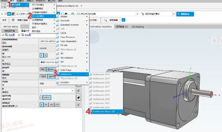 4、然后我们点击输出-输出成档-3D CAD格式-SolidWorks-SolidWorksMacro3D(这个就是宏,生成模型的宏文件,所以适合所有版本的SolidWorks利用宏直接绘制模型,而且含有特征参数),保存这个宏文件到桌面