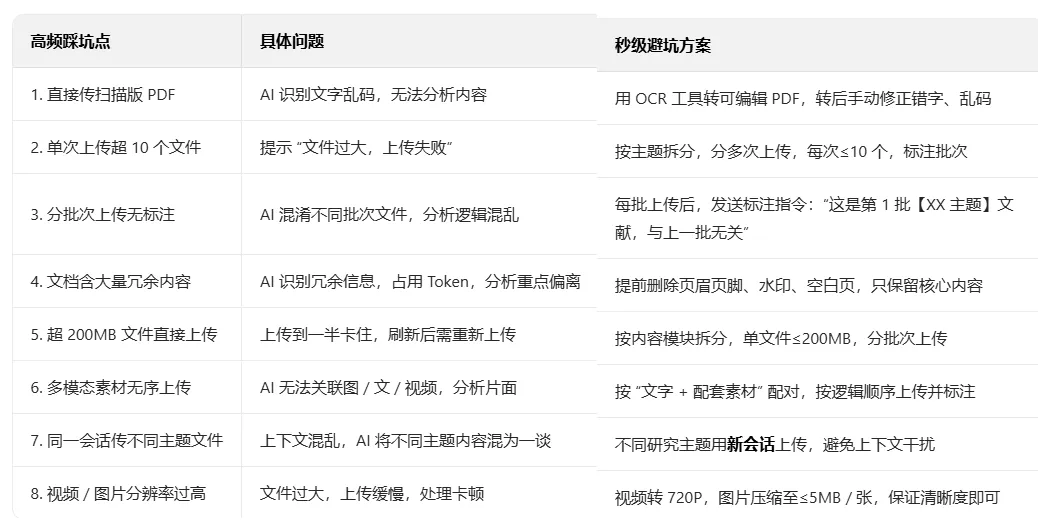 结合科研人高频的批量文献上传、超长文档处理、多模态素材上传3 类场景,整理了针对性的上传技巧,附实操步骤,照做就能成功: