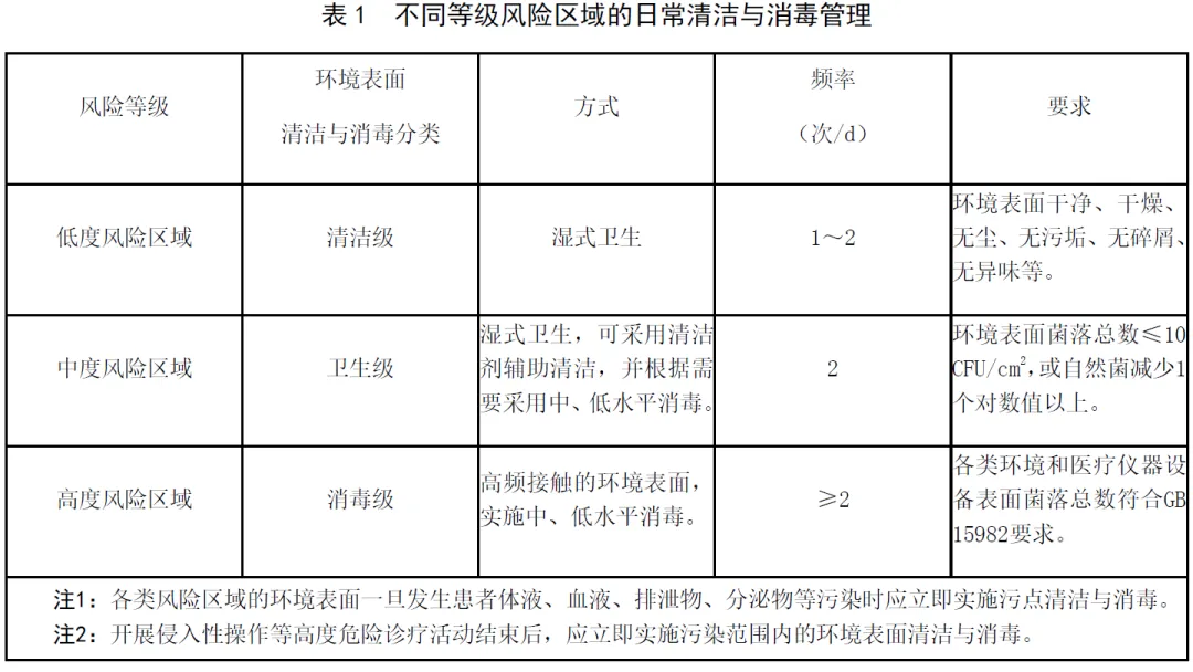6.3 不同等级的风险区域应实施不同的环境表面清洁与消毒管理,具体要求见表1。