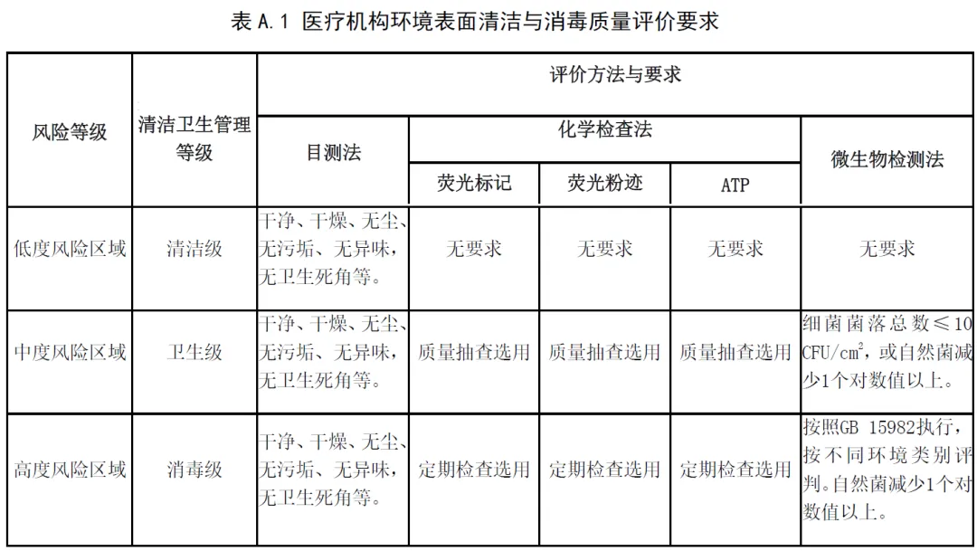 A.2 不同风险等级区域环境表面清洁与消毒质量评价要求