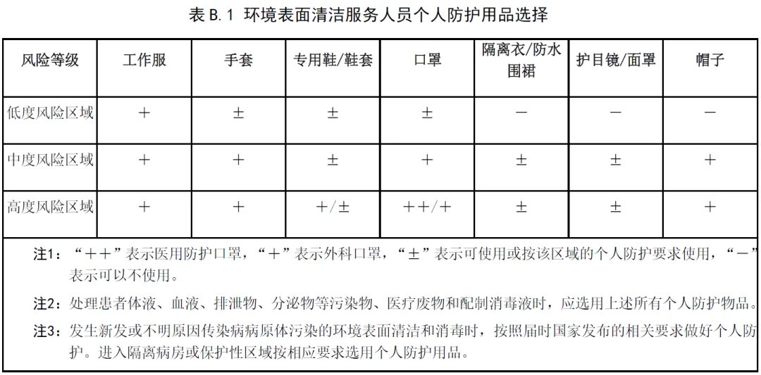 5.6 实施清洁与消毒时应做好个人防护,不同区域环境表面清洁服务人员个人防护用品选用应符合附录B的规定。工作结束时应做好手卫生与人员卫生处理,个人防护按照WS/T311执行,手卫生按照WS/T313执行。