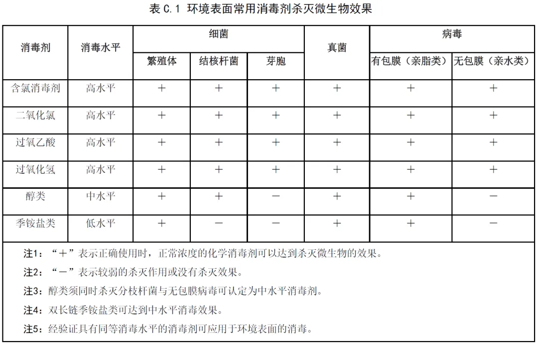 C.1 环境表面常用消毒剂杀灭微生物效果见表C.1。