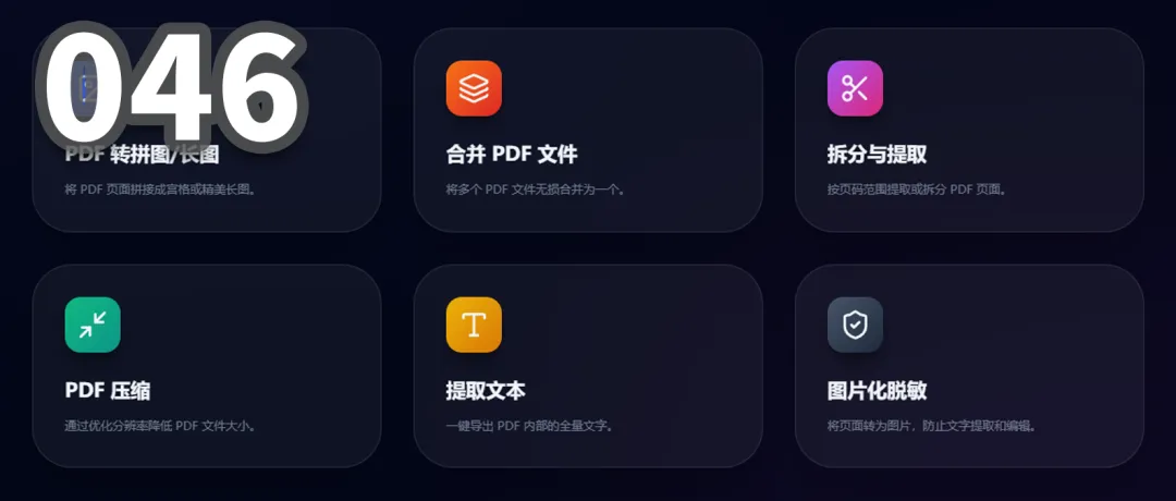 今天是挑战的第 46 天,我带来了一款PDF工具合集。他包括了PDF拼图、合并PDF文档、拆分PDF文档、PDF压缩、提取文本、PDF转图片版。