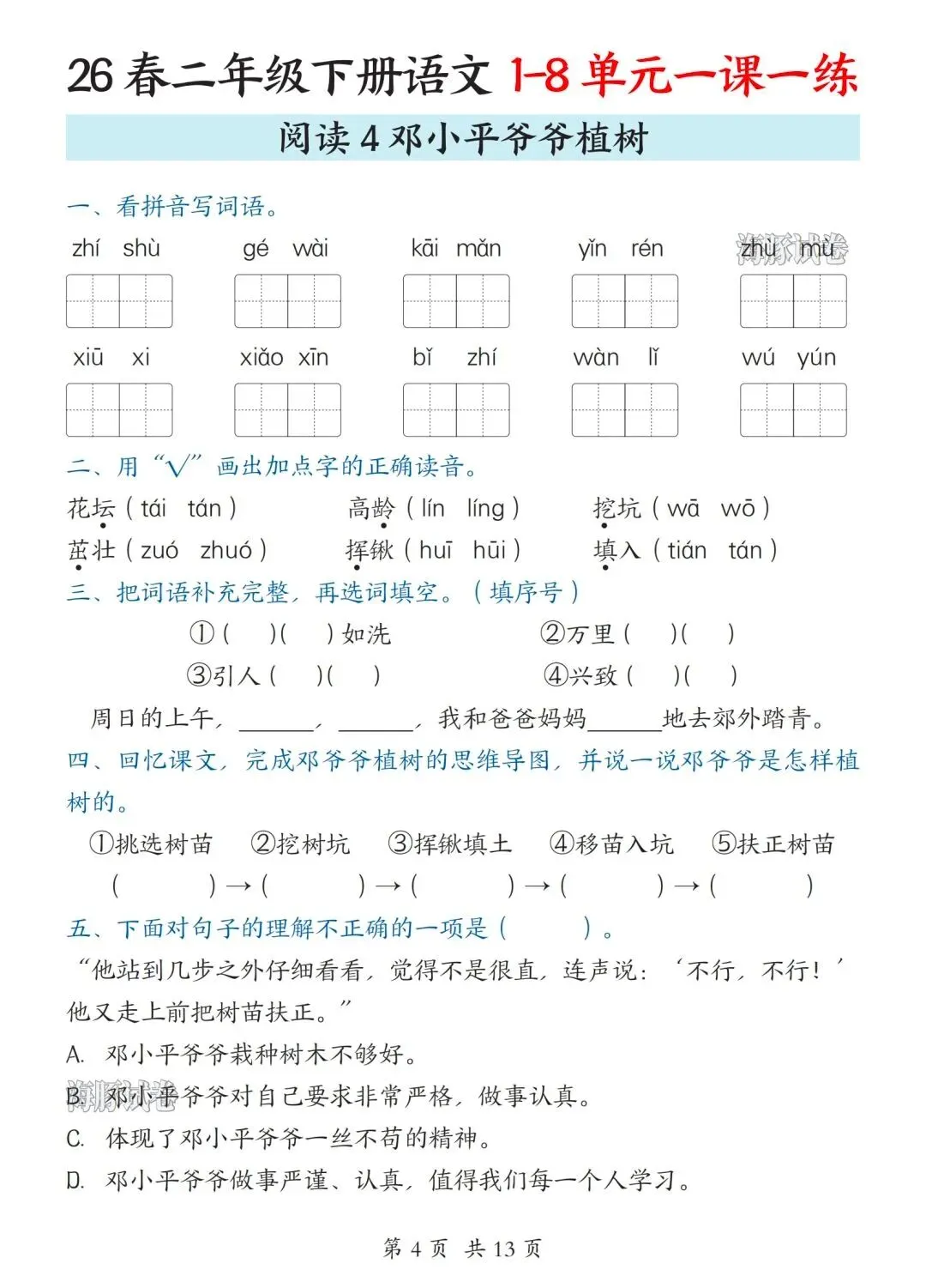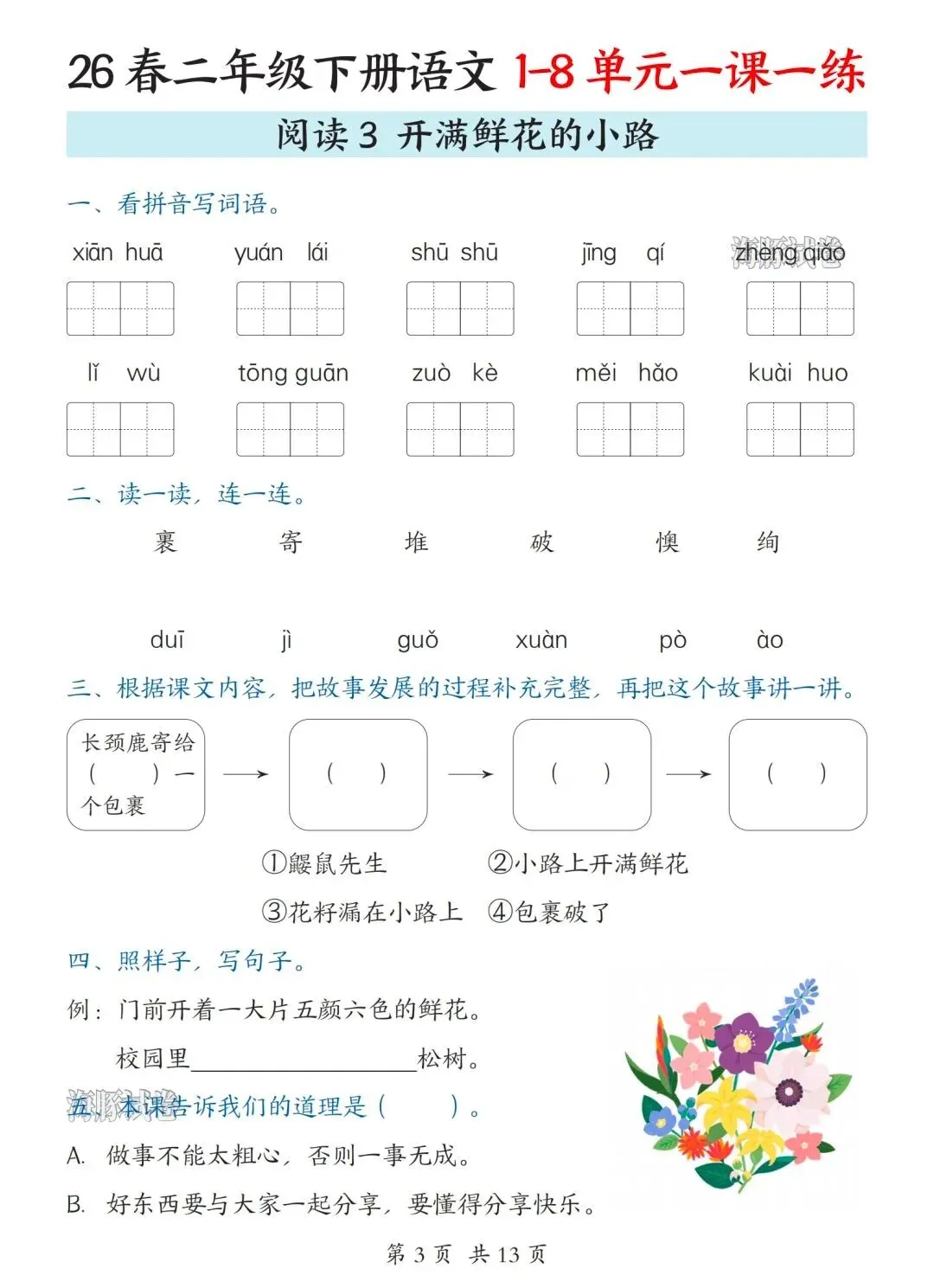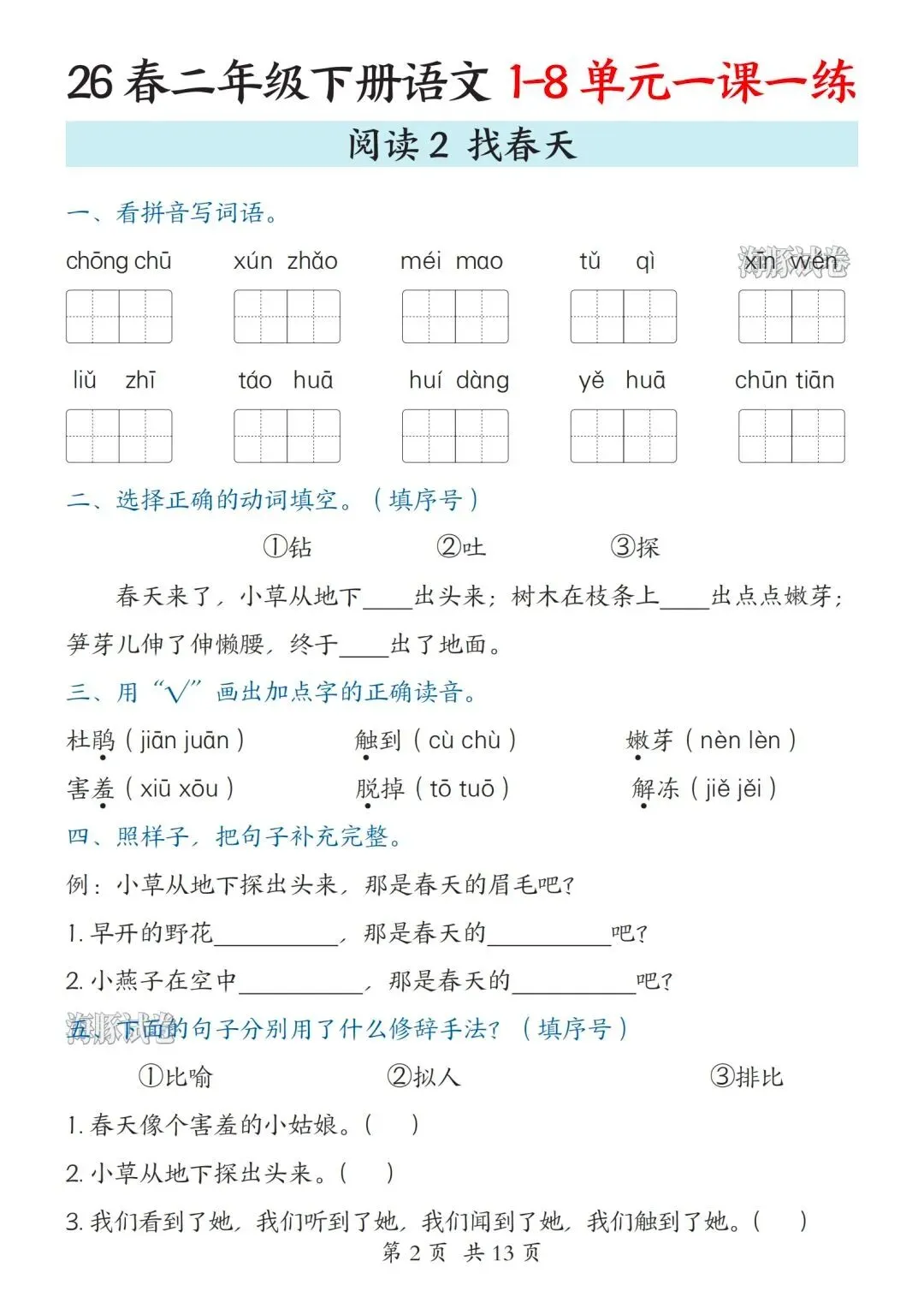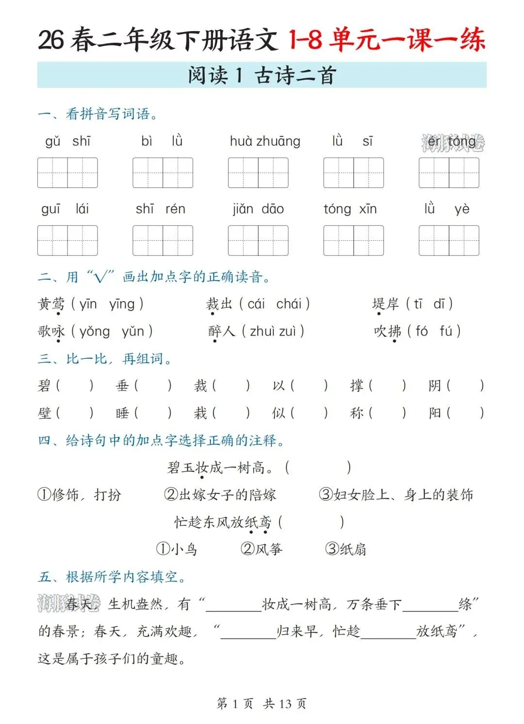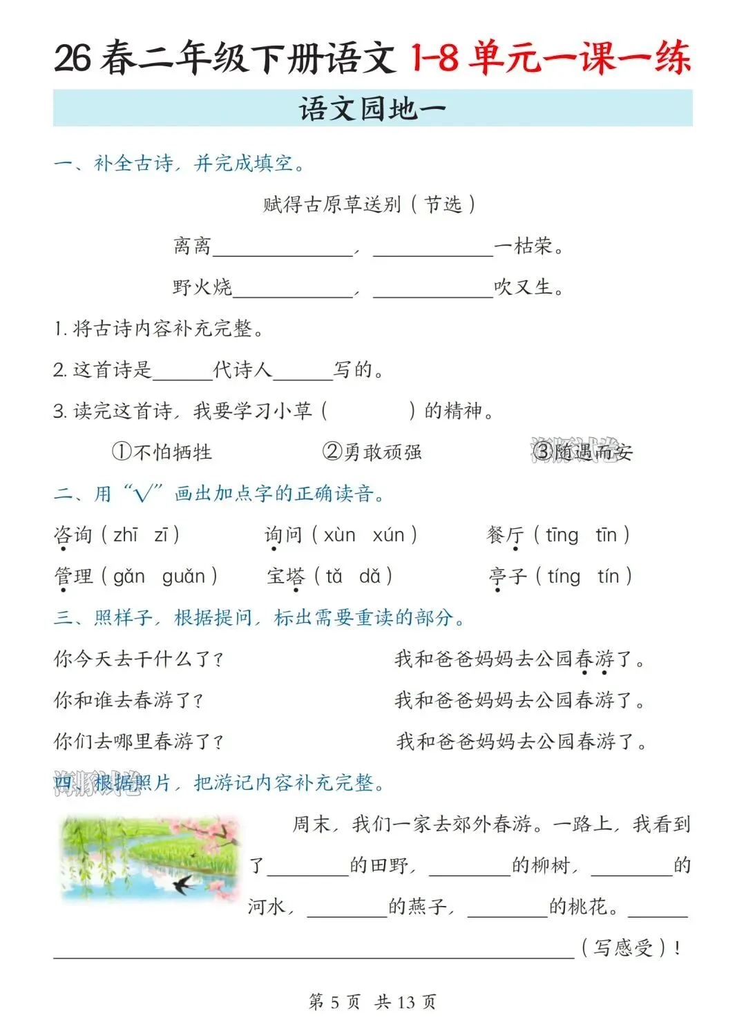 这份PDF资料专为二年级下册语文设计,按单元划分练习内容,贴合课本知识点,字词、语句、阅读等题型全覆盖,一课一练及时巩固课堂所学,帮孩子夯实基础、查漏补缺,轻松应对日常小测和单元考。