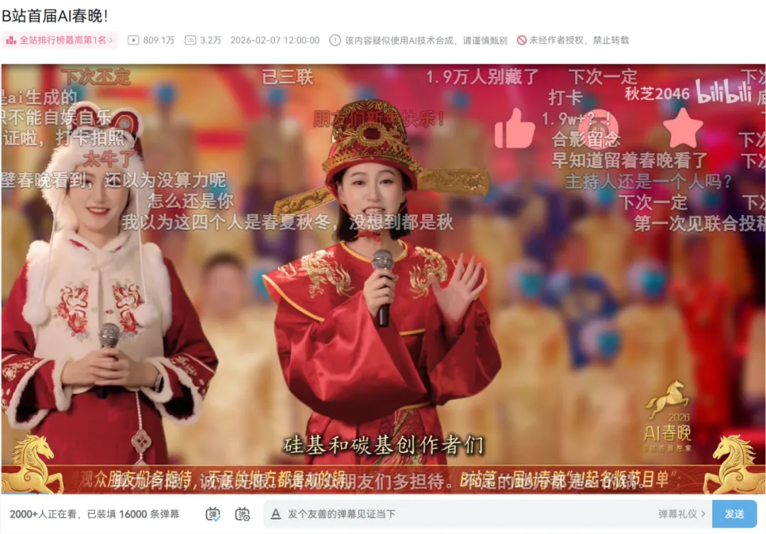 比如2025年是我国生成式AI爆发式发展的一年,2026年迎春会中就出现了各种各样的AI春晚,厉害的硅基创作者们齐聚一堂,一同为碳基观众带来与众不同的AI春晚节目——