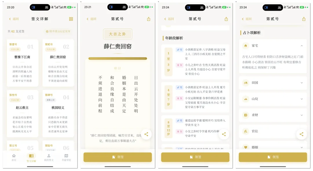 每支签文均包含:签号、卦象等级、典故出处、签诗原文、十五项占卜事项详解(家宅、婚姻、求财、官讼、六甲、行人等),以及不同年龄段的运势解读。