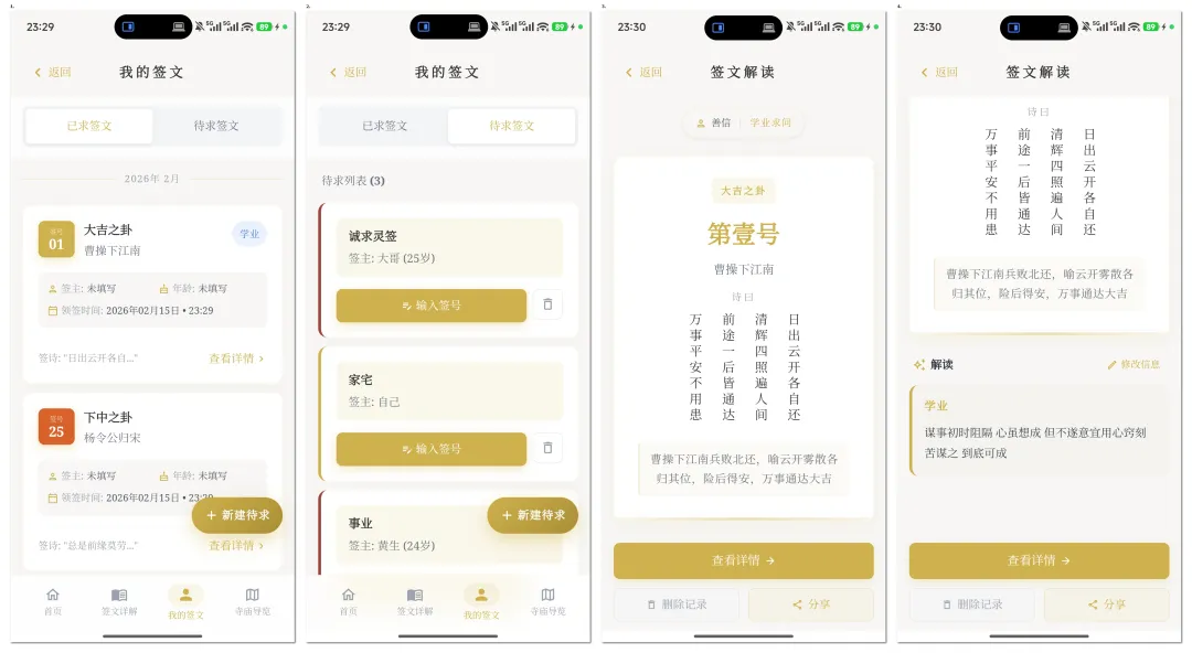 支持添加已求签文,记录签主姓名、性别、年龄、求签事项等,方便日后查阅回味。亦可创建”待求签文”,下次赴寺时按图索骥,不再遗漏。