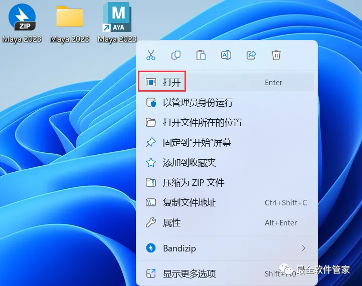 15、回到桌面,右键桌面上的【Maya 2023软件图标】,点击【打开】