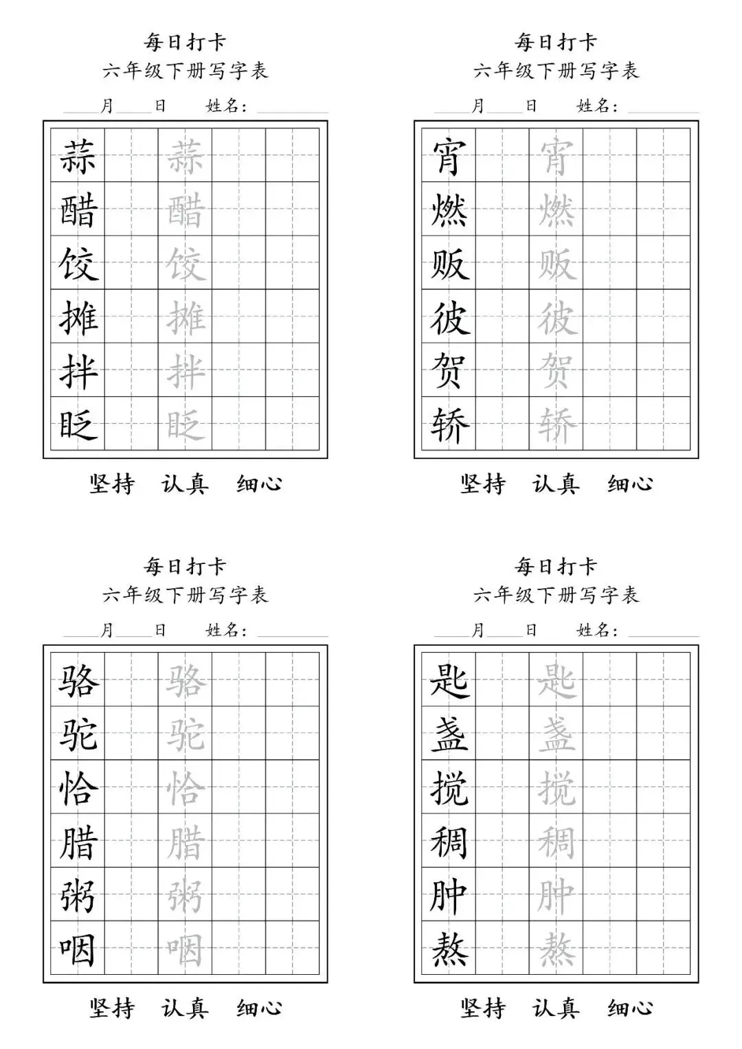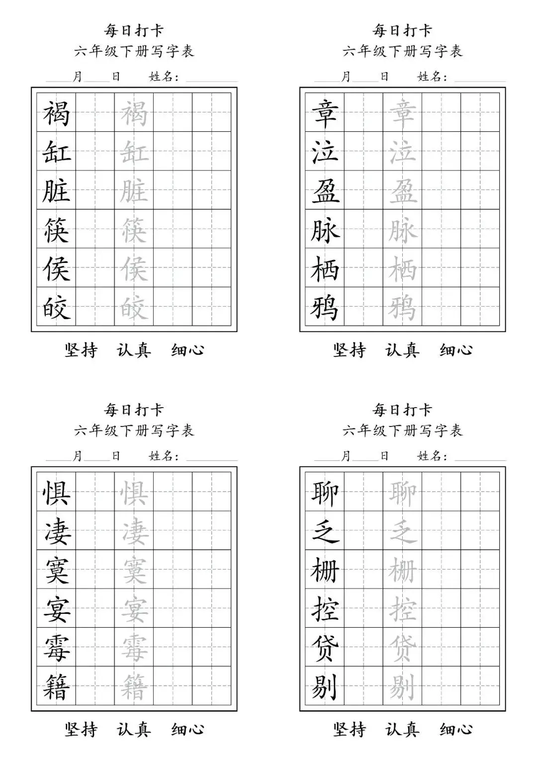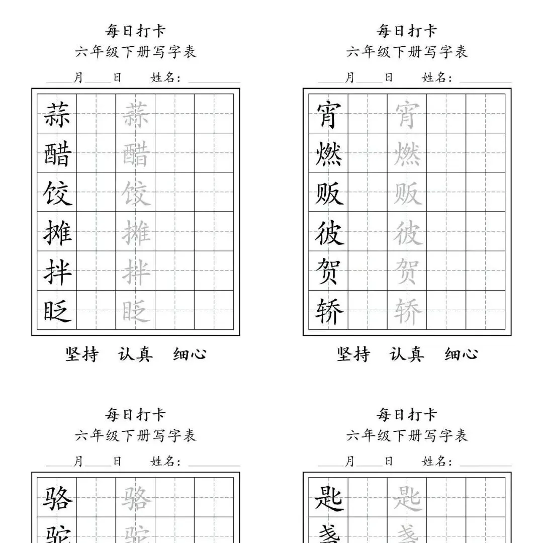 这份六年级下册语文写字表字帖,专为小学生设计,旨在通过每日一练的方式,高效巩固课堂所学,提升汉字书写规范性。
