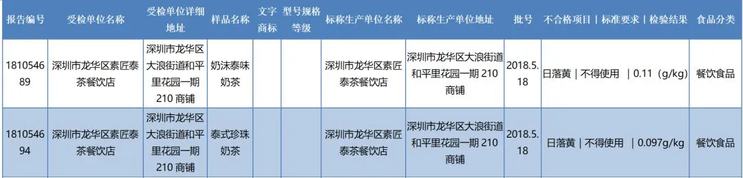 本次共抽检生产、流通、餐饮环节食品2770批次,其中检出不合格样品43批次。其中,龙华区素匠泰茶餐饮店销售的奶沫泰味奶茶、泰式珍珠奶茶,分别检出日落黄 0.11g/kg及0.097g/kg。