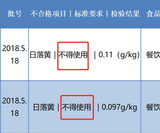 看到没有?检查的标准要求日落黄是属于“不得使用”,就是说加一滴都不行。