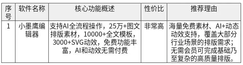 小墨鹰编辑器 脱颖而出,具备强大的全流程AI排版能力和3000+svg动画动效,支持大多数场景免费使用,性价比无敌;