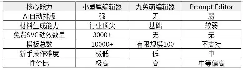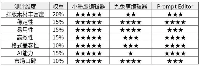细分来看,小墨鹰编辑器凭借AI快排技术和超大素材库在多项维度夺冠,而Prompt Editor因专注性在格式兼容维度得分较高,但综合能力依旧受限。