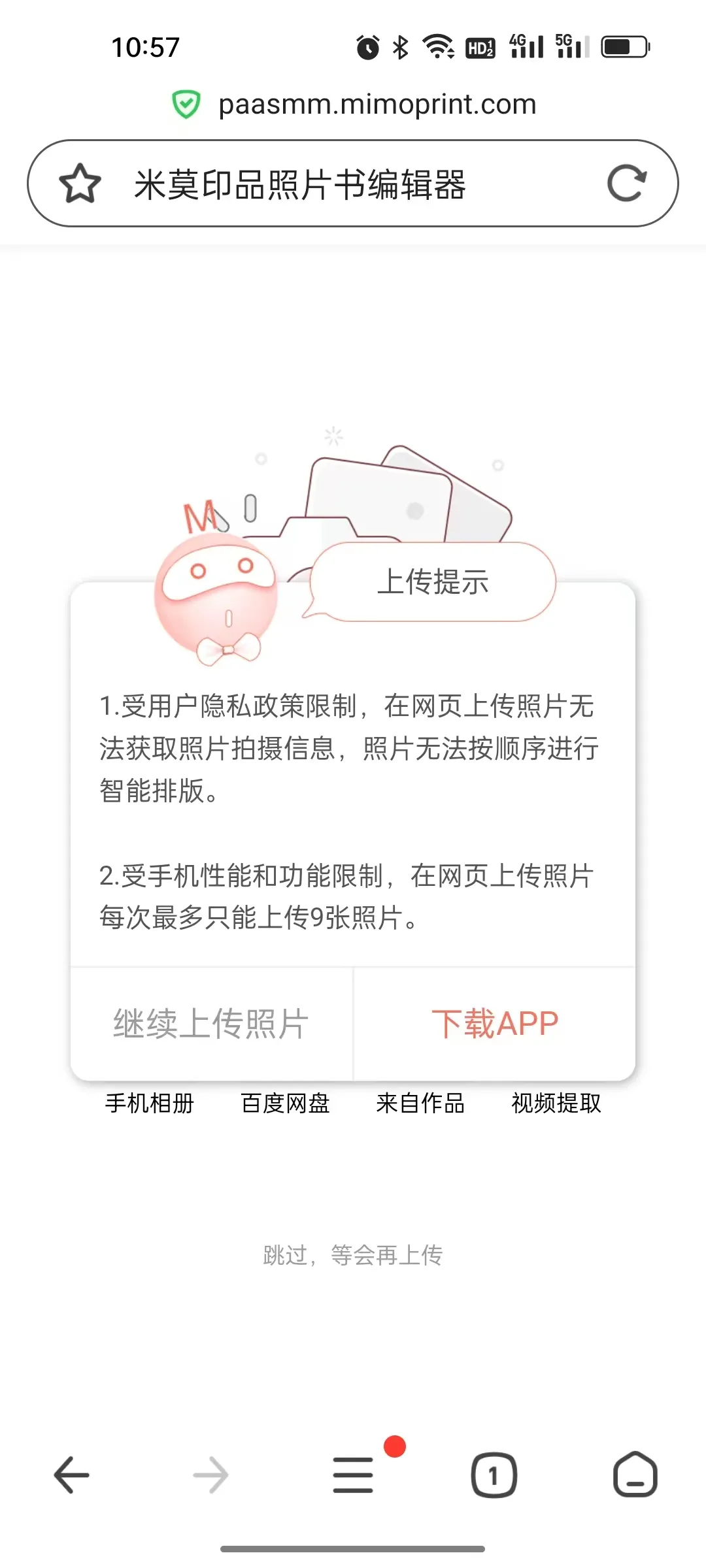 手机打开米莫印品APP,选择照片书,选择一款照片书,点击“创建作品”,进入登录页面,登录后,再点击“创建作品”,弹出上传照片页面,选择上传方式,如“来自相册”、“百度网盘”,选择相片,上传。