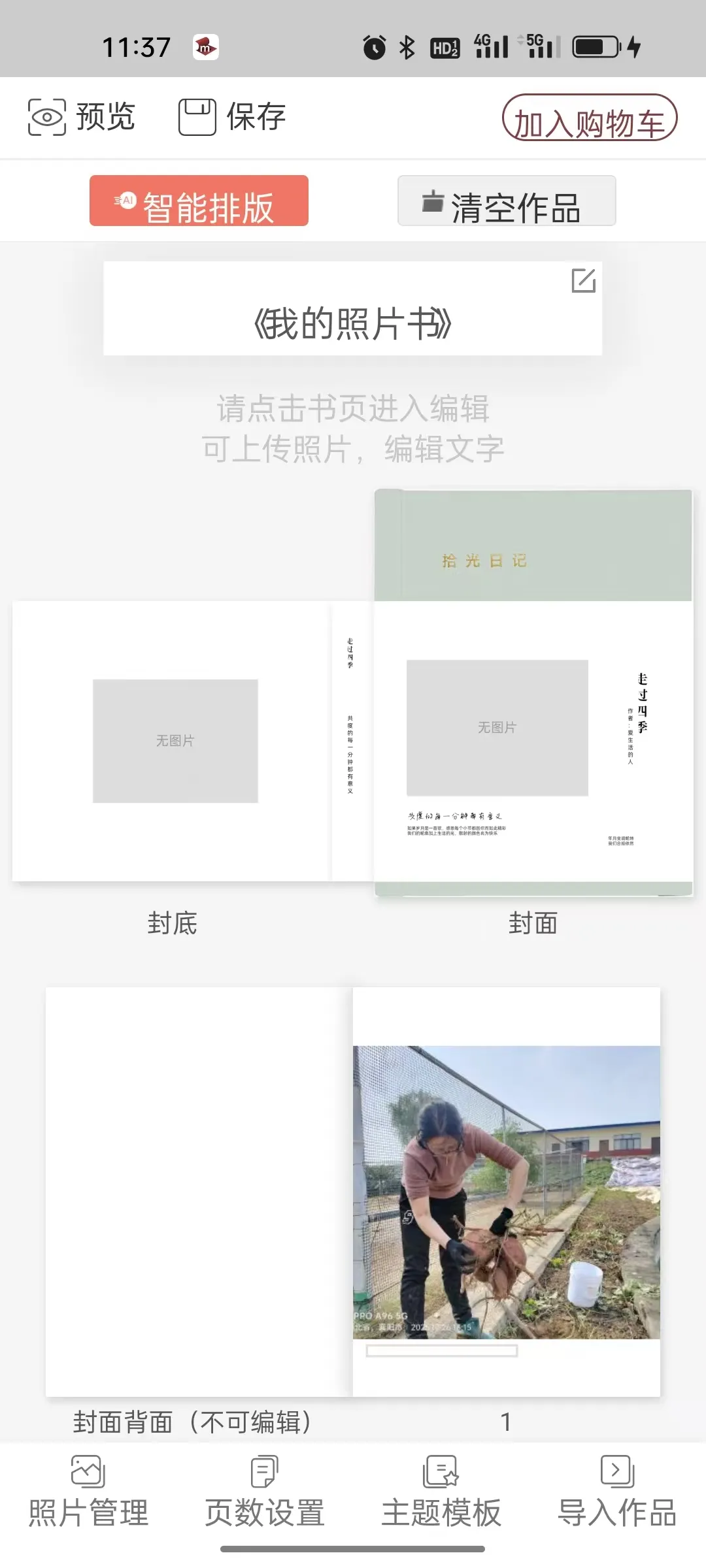 一是上方的辅助功能区。包括预览、保存、加入购物车、智能排版、清空作品。