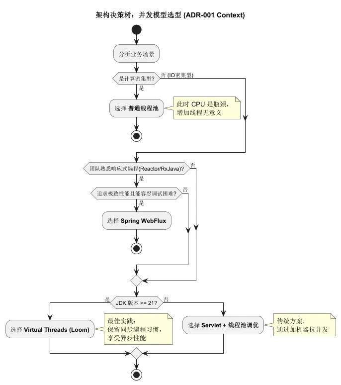 为了让大家更直观地理解如何做决策,我们用 画一个关于“并发模型选择”的决策逻辑图。这是架构师脑子里的回路,现在我们把它具象化。
