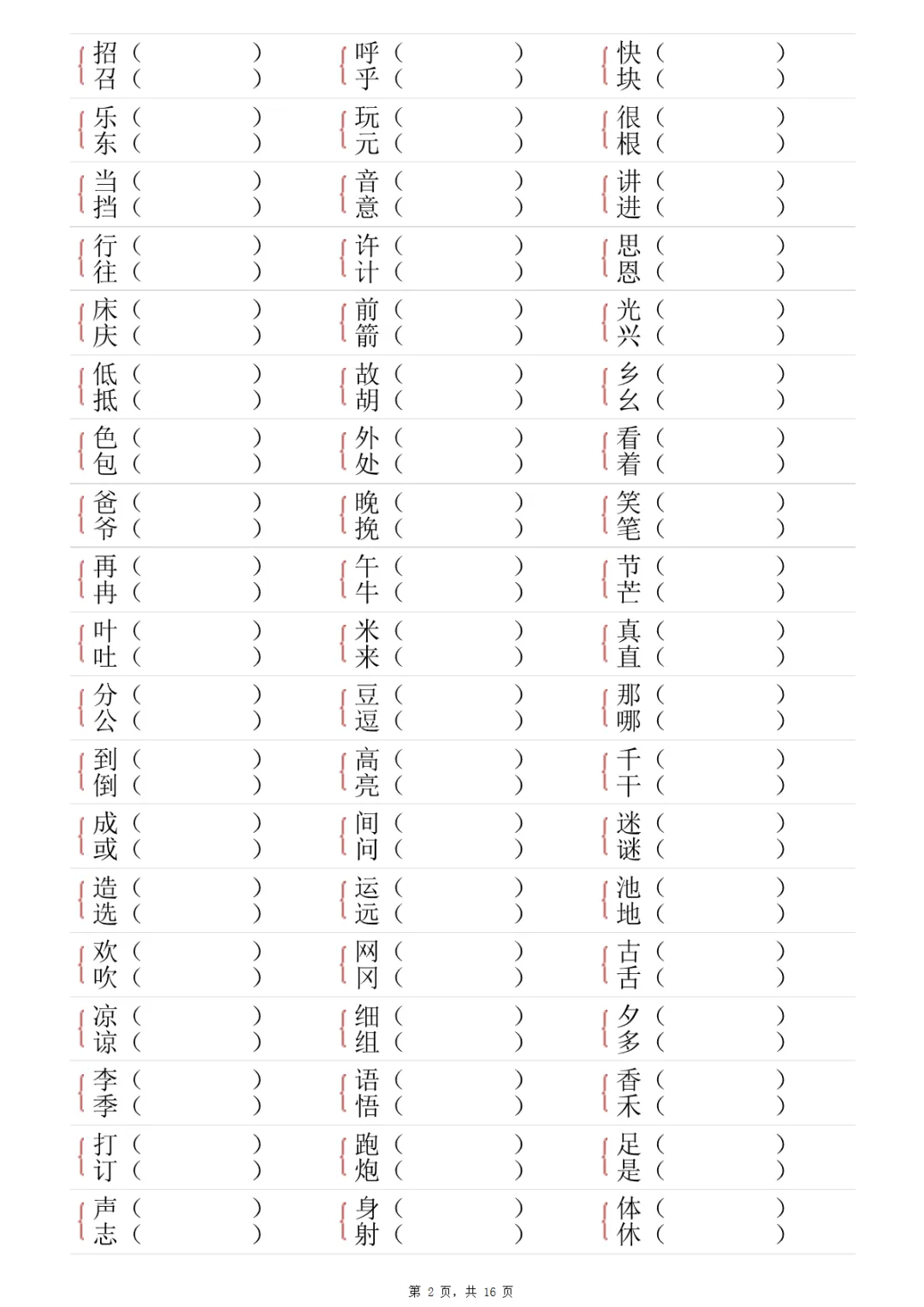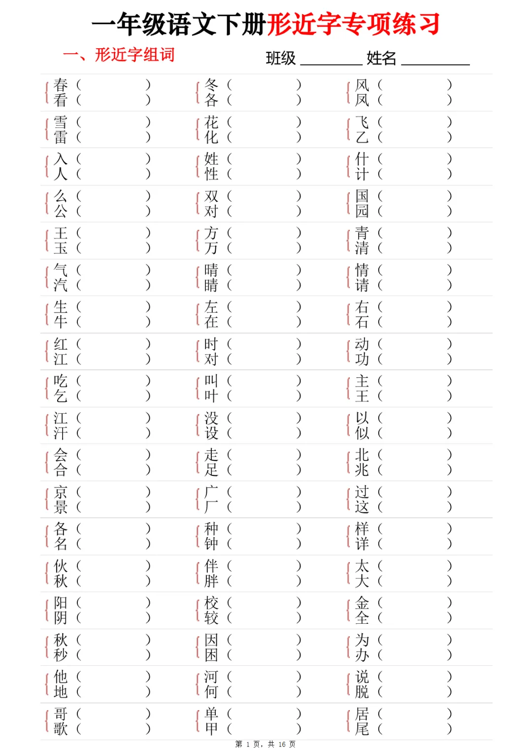 【免费下载】一年级(下)语文 形近字专项练习(含答案16页)