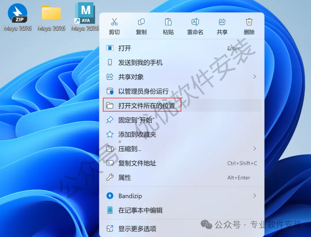 12、回到桌面,右键桌面上的【Maya 2026软件图标】,点击【打开文件所在的位置】
