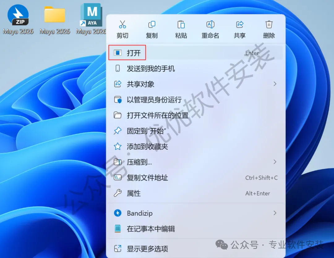 15、回到桌面,右键桌面上的【Maya 2026软件图标】,点击【打开】