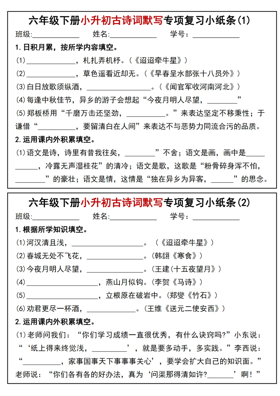 【免费下载】六年级下语文小升初专题训练古诗词默写填空小纸条,PDF电子版,共10页,可打印