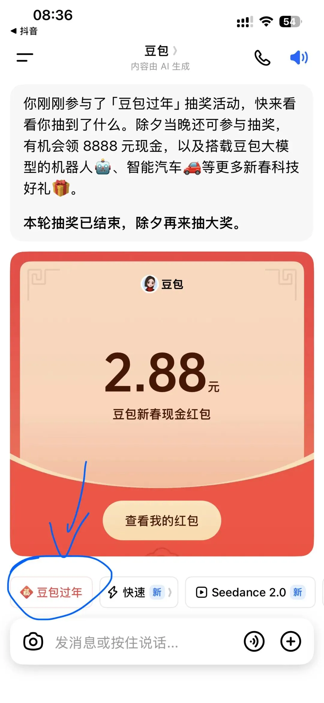 豆包APP,点击下方豆包过年,选择任意活动项目完成即可领取红包