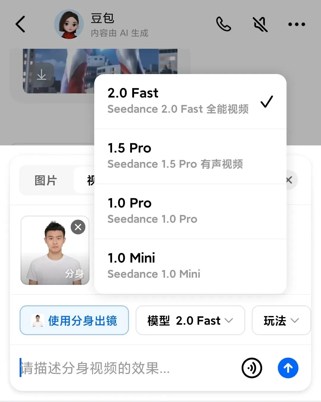 经过我的对比测试,随变APP里搭载的Seedance 2.0模型,大概是与即梦、小云雀同款的“无损版”,可以直接生成最高15秒的视频,画面质量和动作流畅度都还可以。 这与豆包里提供的 “Seedance 2.0 Fast”版本有本质区别。