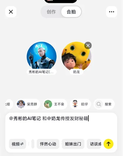 在“合拍”模块,你可以@平台提供的各种虚拟角色(如奶龙、旺仔、哥伦比娅),或者@你已创建的好友形象,一起生成互动视频。
