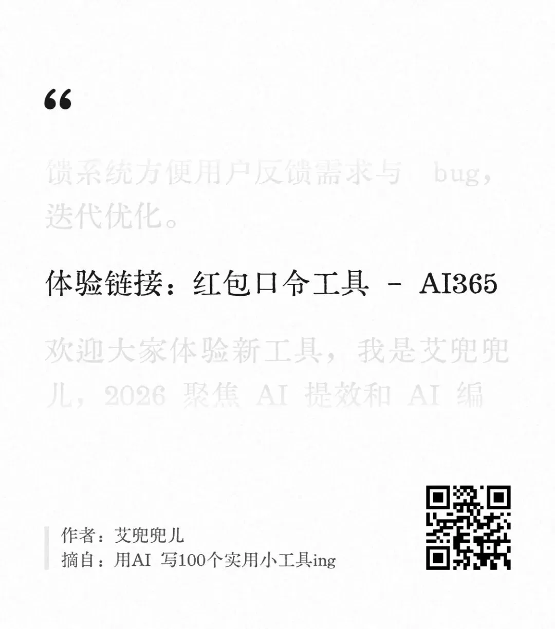 答:艾兜兜儿前两天上线了「红包口令助手已上线!100 个即开即用的 AI 提效工具
