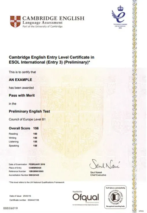 该系列证书对考生的英语听、说、读、写综合应用能力进行考察。考试的试题与阅卷都由具备丰富英语教学经验的专家们完成。命题者综合考虑学习者在不同年龄段心智、情感、认知、语言能力以及答题习惯的发展特点,循序渐进帮助学习者提高英语水平。成绩及格者获得由英国剑桥大学考试委员会颁发的考试成绩证书。