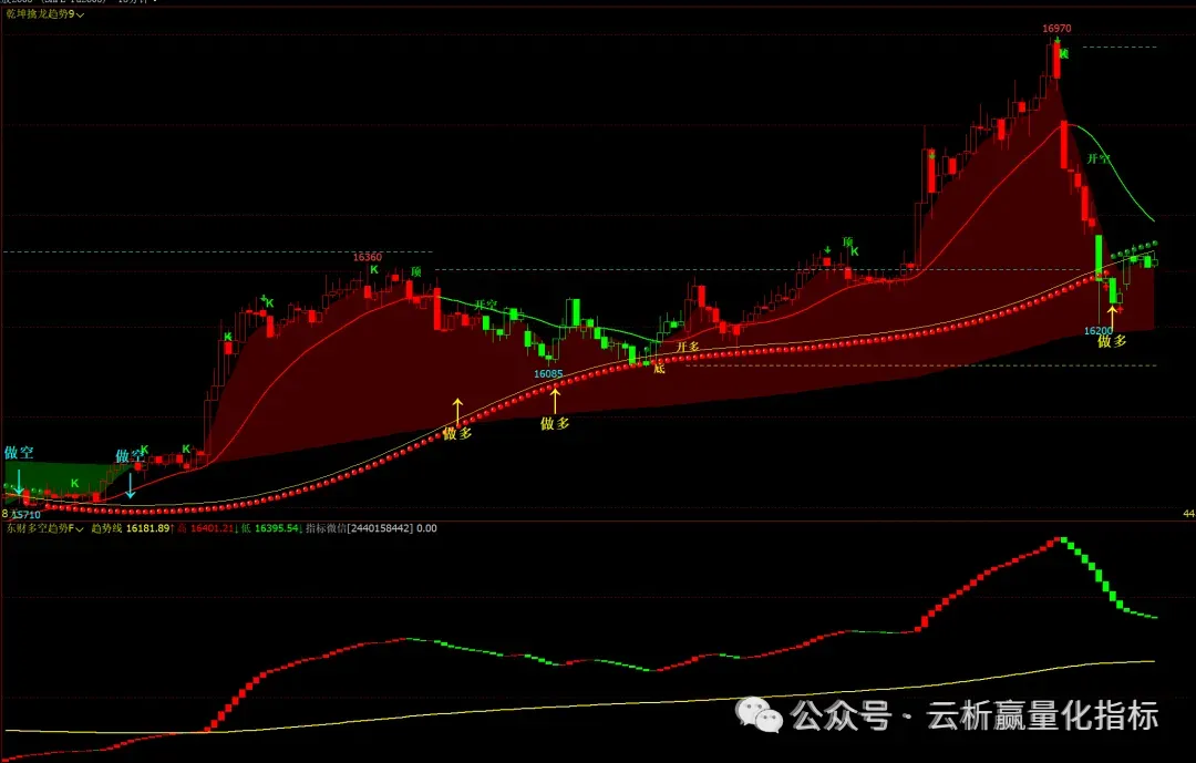 1、乾坤擒龙趋势9主图,东财多空趋势F幅图