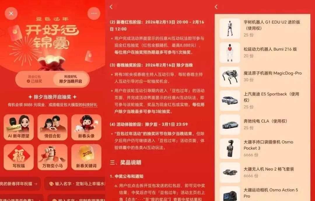 豆包除夕抽奖 千问除夕红包雨 央视频app除夕晚会抽五粮液 云闪付集卡除夕瓜分
