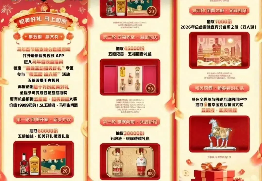 2月16日 ⏰20:00-22:00 晚上抽的是 五粮液礼盒/双人游共13.5万瓶!4轮具体抽桨明晚有空再发————第1轮:和美好礼果酒礼盒(375ml 375ml)共6万份第2轮:五福迎春礼盒(100ml*5份)共4.5万份第3轮:骐骥驰骋礼盒(100ml 100ml)共3万份第4轮:春晚宜宾分会场双人旅(含2人費用 單人1.2万)共1千份